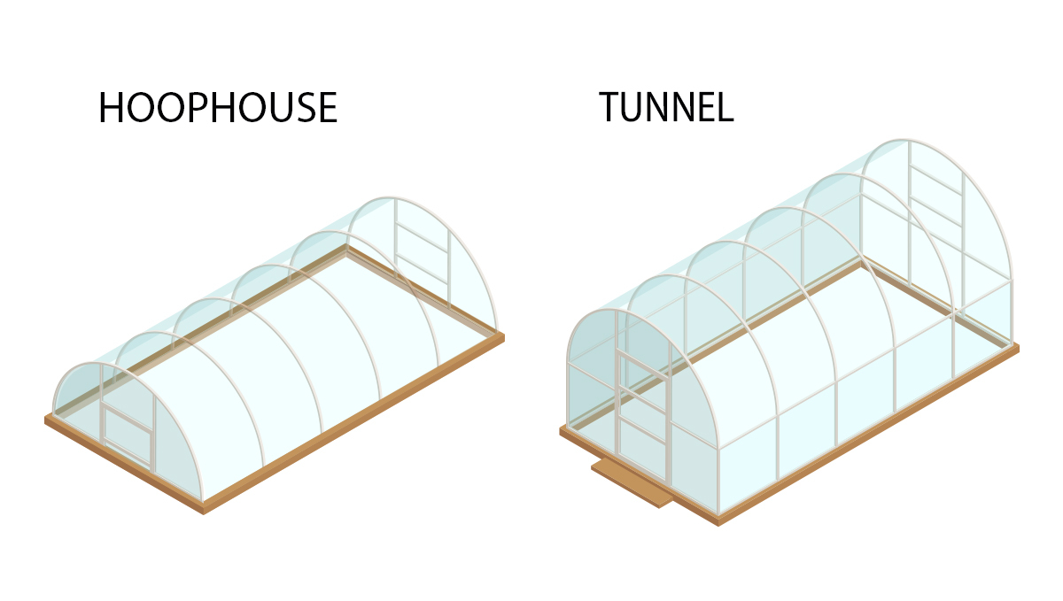 Angelehnt, als Foilentunnel, mit Giebel und als Reifenhaus.