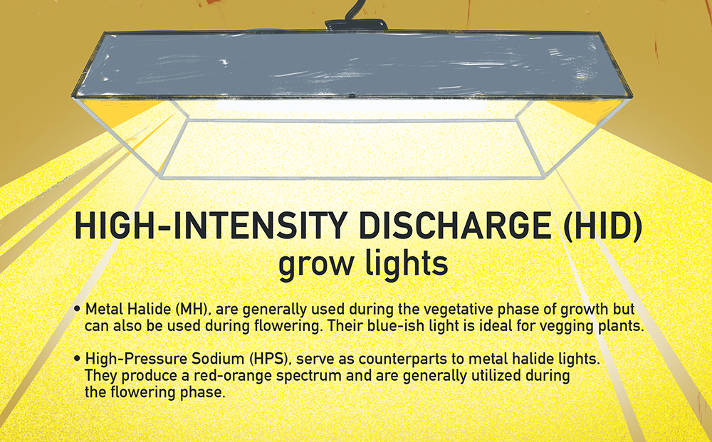 High-Intensity-Discharge (HID) sind große Glühbirnen, die eine intensive Lichtmenge erzeugen, welche perfekt für den Anbau von Cannabis geeignet ist. HID-Lampen sind die beliebtesten und werden wegen ihrer Effizienz, ihrer Leistung und ihres Wertes am häufigsten verwendet. Ihr Preis ist höher als der von Leuchtstoff- und Glühlampen, außerdem liefern sie zusätzliches Licht pro verbrauchter Stromeinheit.