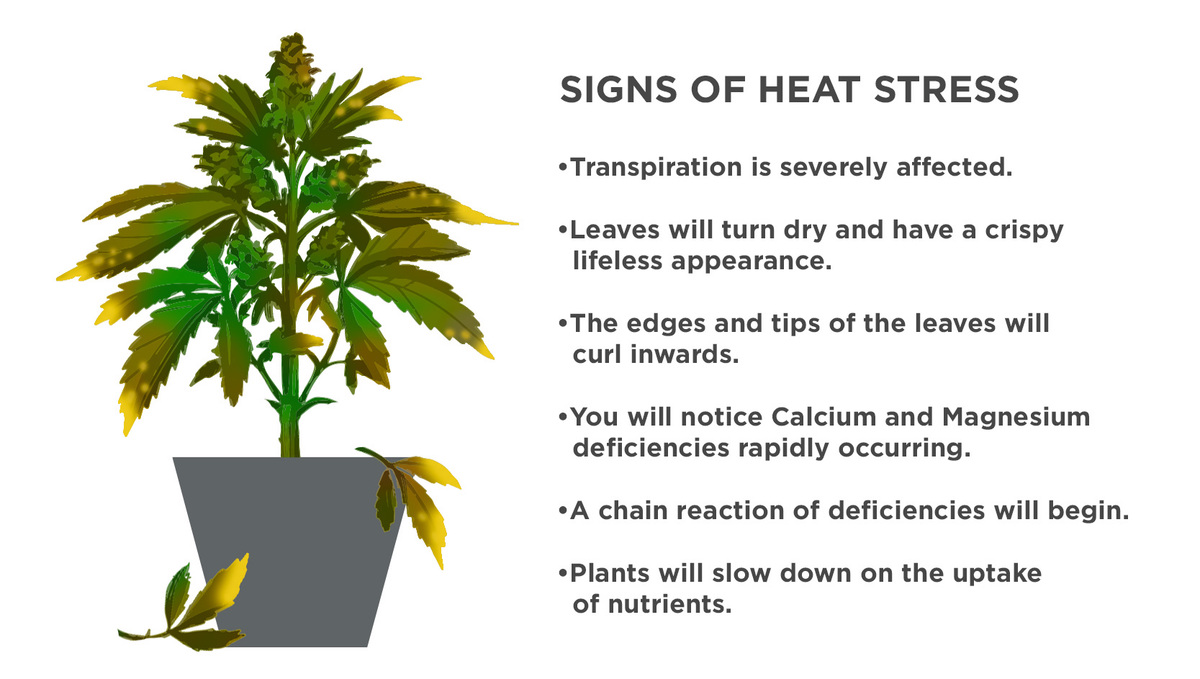 Da Cannabispflanzen Wasser durch ihre Wurzeln oder ihre Blätter transpirieren, wird bei einem unerwarteten Temperaturanstieg die Wassermenge, die die Pflanze verbraucht, reduziert. Als Abwehrmechanismus reduzieren Cannabispflanzen die Menge an direktem Sonnenlicht, die sie verarbeiten, was zu einem Rückgang der Photosynthese, der Umwandlung von Zucker und der Aufnahme von Nährstoffen führt.