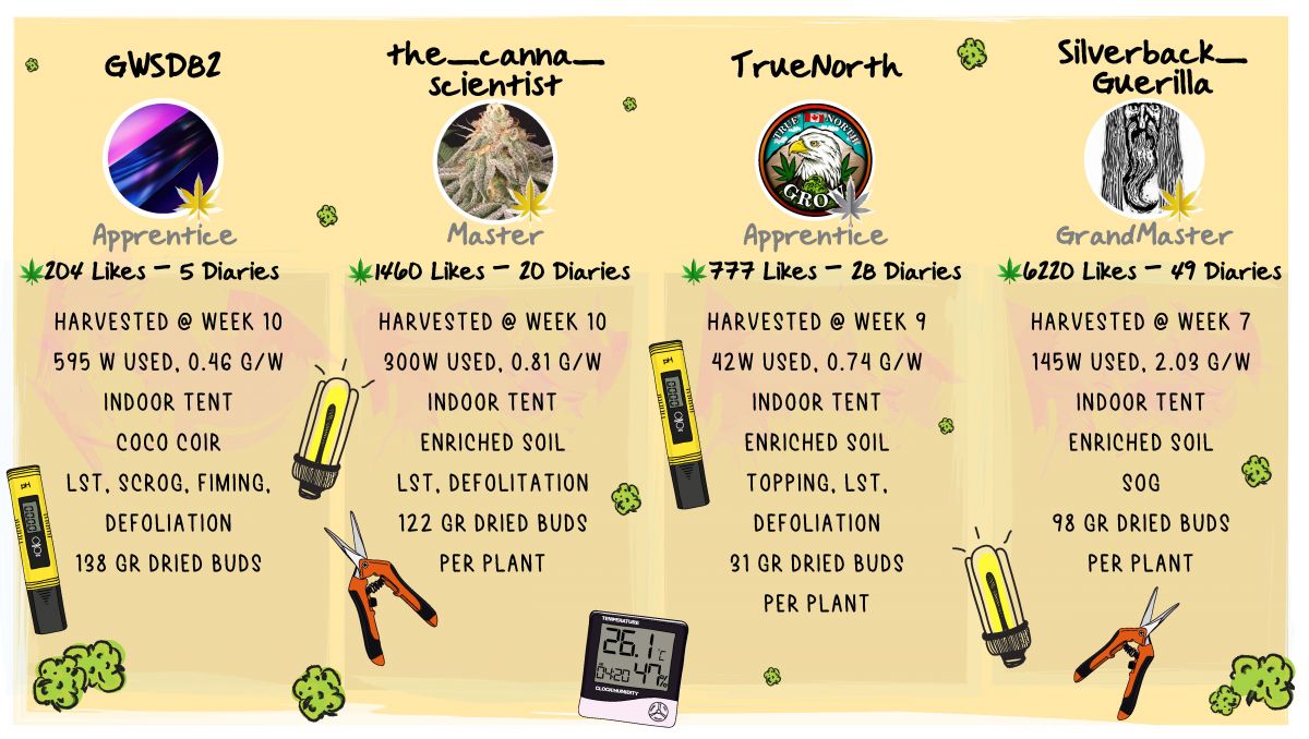 The_canna_scientist hat deutlich mehr Erfahrung. Obwohl er erst seit weniger als einem Jahr auf GD aktiv ist, hat er es geschafft, 14 Strains zu ernten, 1405 Likes zu sammeln und sich den Titel "Master" zu verdienen. In seinem Trophäenschrank steht sogar ein "Diary of the Month"-Pokal, den er für FastBuds' Purple Lemonade Auto erhalten hat.