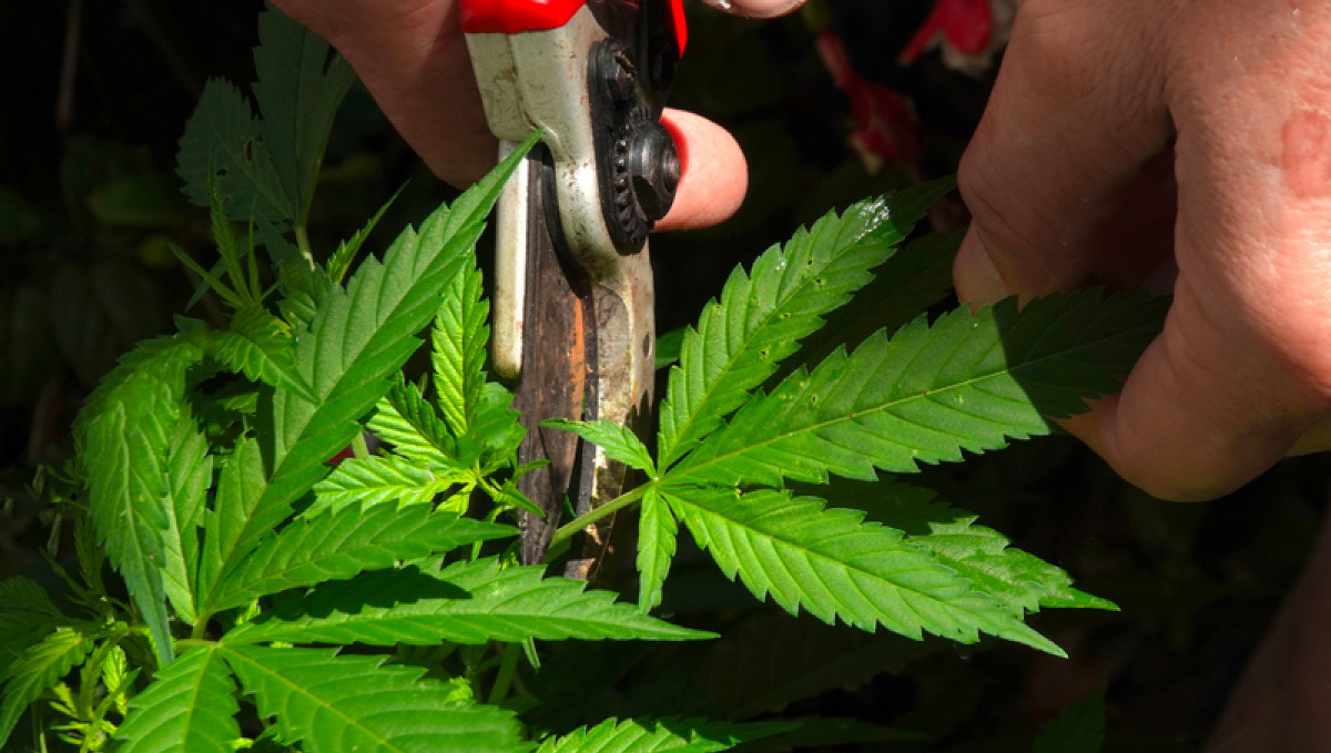 Erfahrenere Grower zupfen die Blätter mit den Fingern ab, wobei sie ihre Fingernägel benutzen, um einen sauberen Schnitt zu machen.