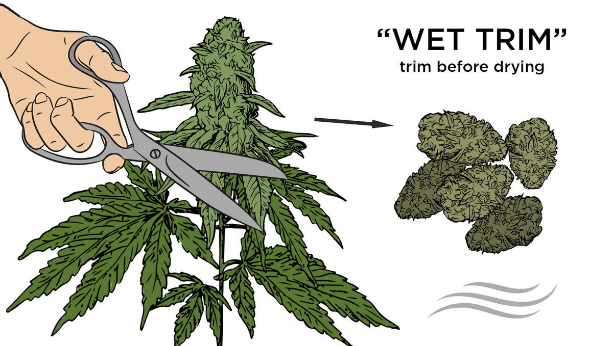 Es gibt zwei Hauptmethoden zum Trocknen und Beschneiden von Cannabispflanzen. Bei der einen Methode wird jedes Blatt akribisch beschnitten, wenn die Pflanzen frisch geerntet werden. Diese Methode ist als "wet trimming" bekannt und kann sehr zeitaufwändig sein. Sicher, die Dinge werden klebrig. Aber lass dich davon nicht beirren. Viele Grower entscheiden sich für das Wet Trimming, weil es einige wichtige Vorteile mit sich bringt.