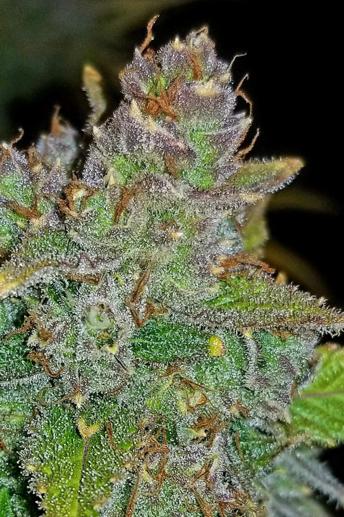 Die Kelche wölben sich aus, was zu spitzen, wuchtigen und langen Buds führt, über denen die Trichome glänzen. Aus der Nähe betrachtet sind die Buds eine Mischung aus Grün und Violett mit dicken, orangefarbenen Härchen. Extrem süßer Geruch, bei dem das Wasser im Mund zusammenlaufen kann.