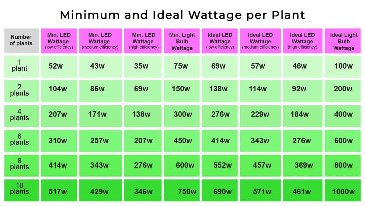 A pesar de que los LED sean más eficientes, hay que proporcionar al menos la potencia mínima necesaria para que las plantas se desarrollen correctamente. Si no quieres gastar demasiado, puedes conformarte con proporcionar la potencia mínima de LED (o el equivalente para bombillas) por planta que se indica a continuación, pero para obtener los mejores resultados se recomienda proporcionar la potencia ideal.