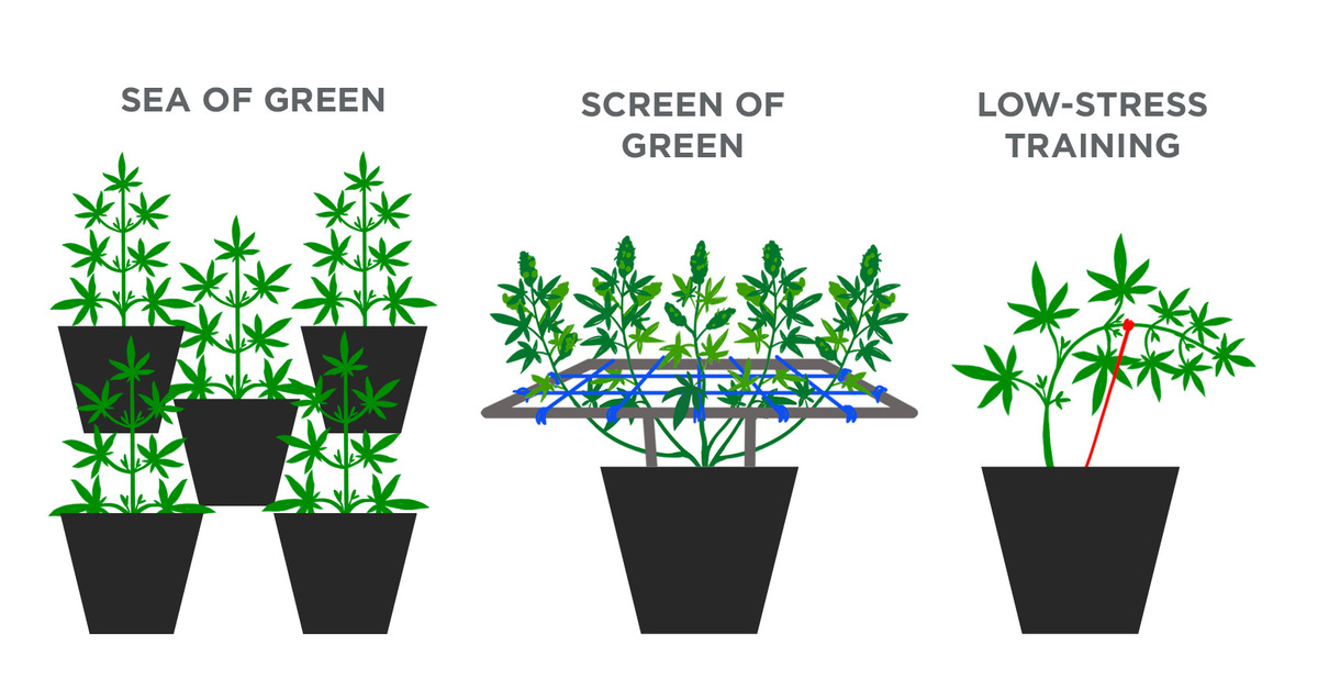 • Le Low stress training consiste à attacher les parties les plus hautes de la plante, afin de créer un couvert végétal uniforme de bourgeons de grande taille.