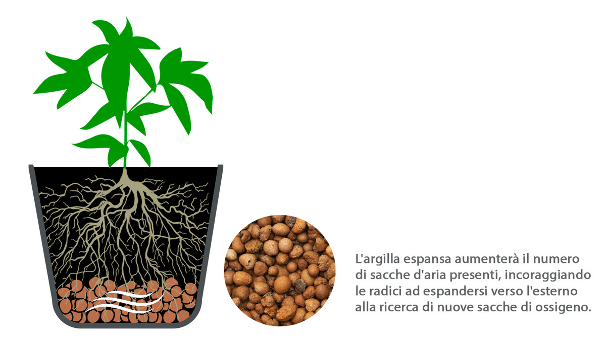 Unita alla fibra di cocco con un rapporto 50/50 o utilizzata per rivestire il fondo di 1-2 pollici dei vasi, l' argilla espansa aumenterà il numero di sacche d'aria presenti, incoraggiando le radici ad espandersi verso l'esterno, alla ricerca di nuove tasche ricche di ossigeno.