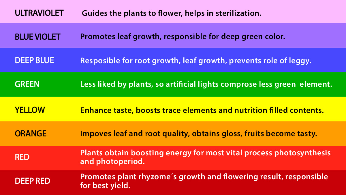 Le regole generali sono la luce "blu" = piante più corte e più forti con più foglie, la luce "rossa" = più alta e più debole (rispetto alle piante coltivate sotto luci "blu") con meno foglie.