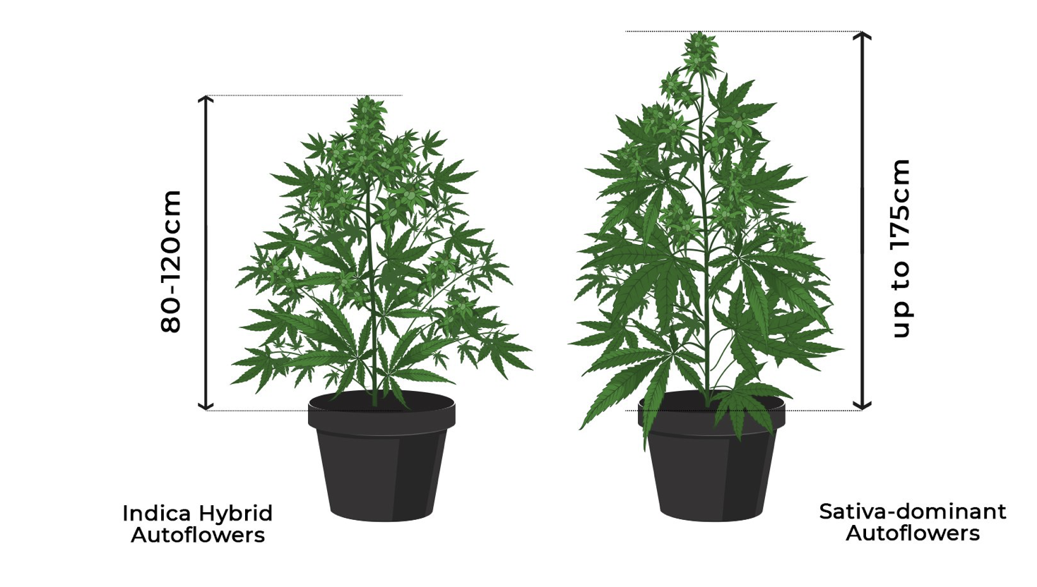 Większość odmian automatycznie kwitnących osiąga wysokość około 50-100 cm, ale wielkość rośliny zależy od genetyki i warunków uprawy. Ponadto wszystkie szczepy są różne, więc znajdziesz automaty o dominacji Sativa i Indica; Większość automatycznie kwitnących hybryd Indica utrzyma się na granicy 80-120 cm, ale odmiany automatycznie kwitnące z dominacją Sativy mogą osiągnąć nawet 175 cm wysokości.
