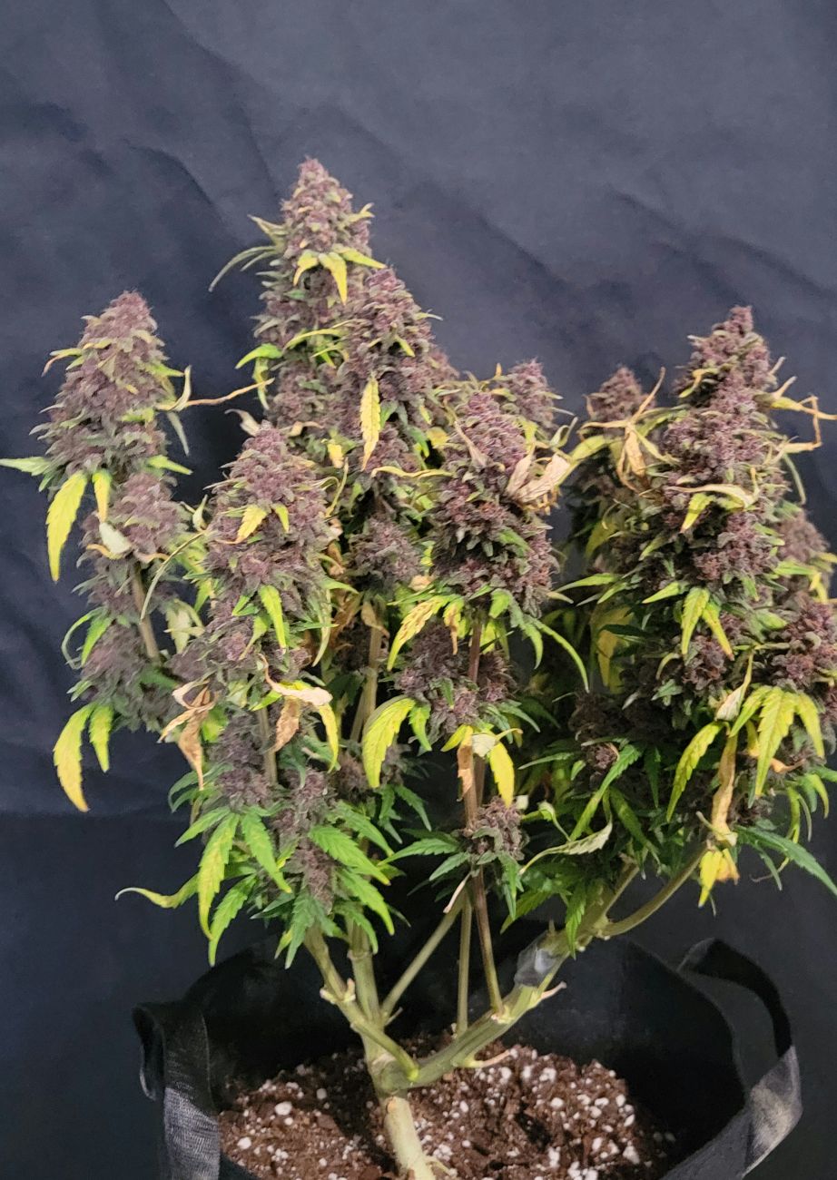 All three plants were consistent in size, yield and quality. One had a slight shade of purple, the other two were not purple at all. Good plant structure, easy to grow, nice dense high quality buds. One of the better seeds I’ve gotten here.