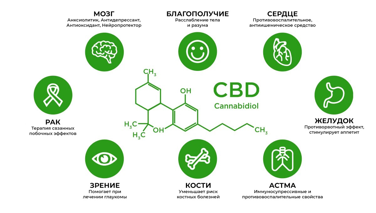 В отличие от ТГК, каннабидиол не является психоактивным веществом и широко используется благодаря своим целебным свойствам.