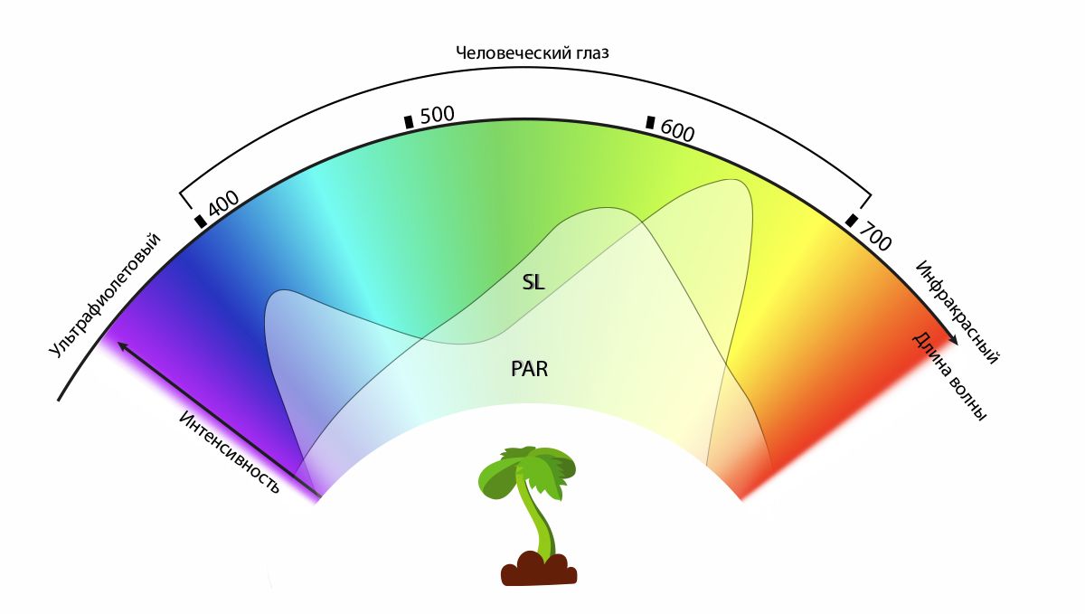 • Интенсивность света измеряется в PAR, а не в люменах.
