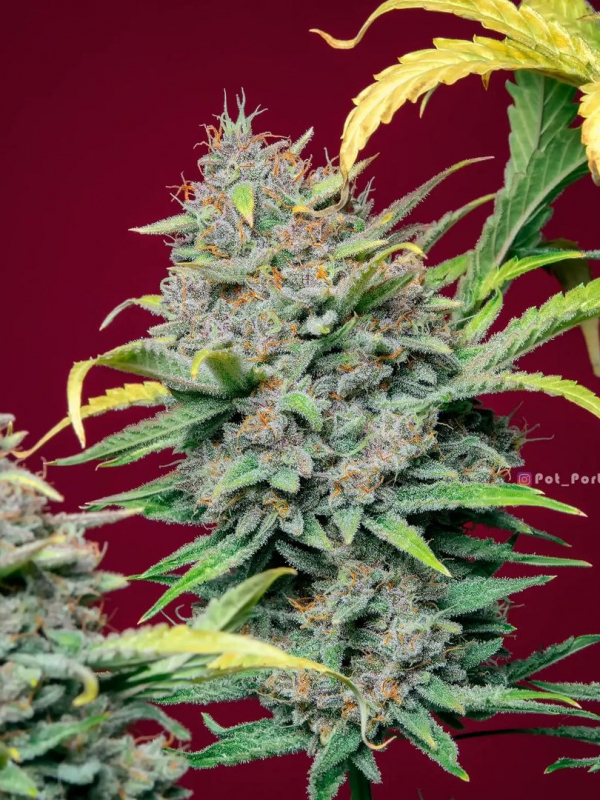 Even though it can grow up to 1m, this cultivar stays very compact while delivering up to 550gr/m2. It grows one tall main cola with large thick fan leaves, typical of Indica strains, and very symmetrical side branches that are enveloped in beautiful buds from top to bottom. The buds can develop reddish tones, flurried with pink and purple while packing frost like crazy, she will be completely covered in strawberry scented trichomes by harvesting time.